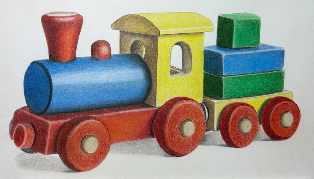 Bei Gemma Chambers Art (keine bezahlte Werbung) kann man wählen, ob man Videosammlungen kaufen möchte oder eine Mitgliedschaft buchen möchte, die man sowohl monatlich als auch jährlich abschließen kann. Das finde ich ehrlich gesagt fantastisch und habe mich dort für eine Mitgliedschaft eingeschrieben, die ich monatlich kündigen kann. Man hat dadurch Zugriff auf viele wunderschöne Lektionen. Eine davon war dieser kleine Zug aus Holzklötzchen und da habe ich die Prismacolor Stifte jetzt ausprobiert. Ja, es ist gewöhnungsbedürftig, mit so weichen Stiften zu malen. Schauen wir einfach mal, wie sich das weiterentwickelt.