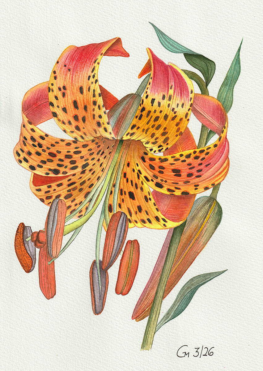 Eine weitere Lektion im Kurs „Watercolor botany in detail“ von Margarita Astashova wurde diese Tiger-Lilie gemalt. Ich fand das extrem schwierig. Mal abgesehen davon, dass ich immer noch mit feinen Linien kämpfe, obwohl ich mir inzwischen richtig tolle spitze Pinsel angeschafft habe, haben mir die Schatten bei einer Pflanze mit sovielen Texturen echt Kopfzerbrechen bereitet.